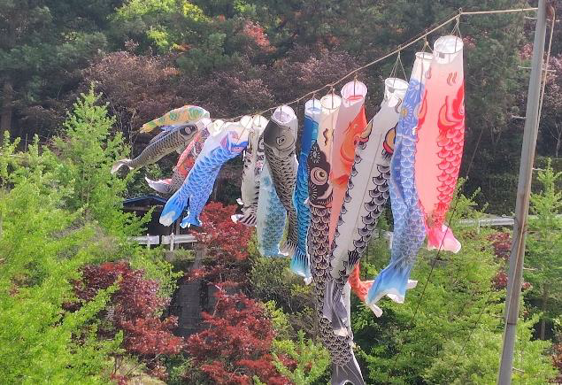 今年は地域の方からご寄付いただいた鯉のぼりを含めて24匹が、遊子谷簡易郵便局付近の谷を渡り優雅に泳いでいました。
