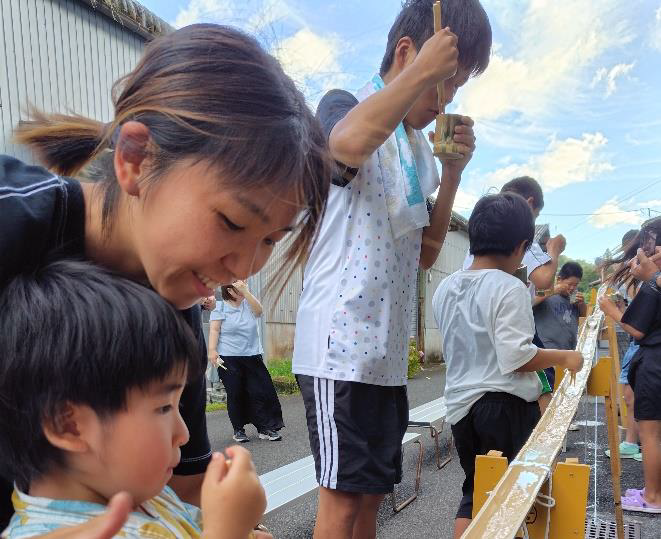 参加した子どもたちは、そうめん流し用の竹の器や箸を削ったり、ピザづくりをしたり、その他にも輪投げやヨーヨー釣り、射的などのゲーム楽しんだり、スイカ割り、花火など多彩な催し物を体験し、参加者全員でそうめん流しやピザを食べて楽しく交流しました。