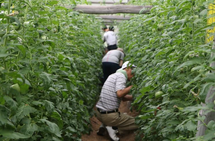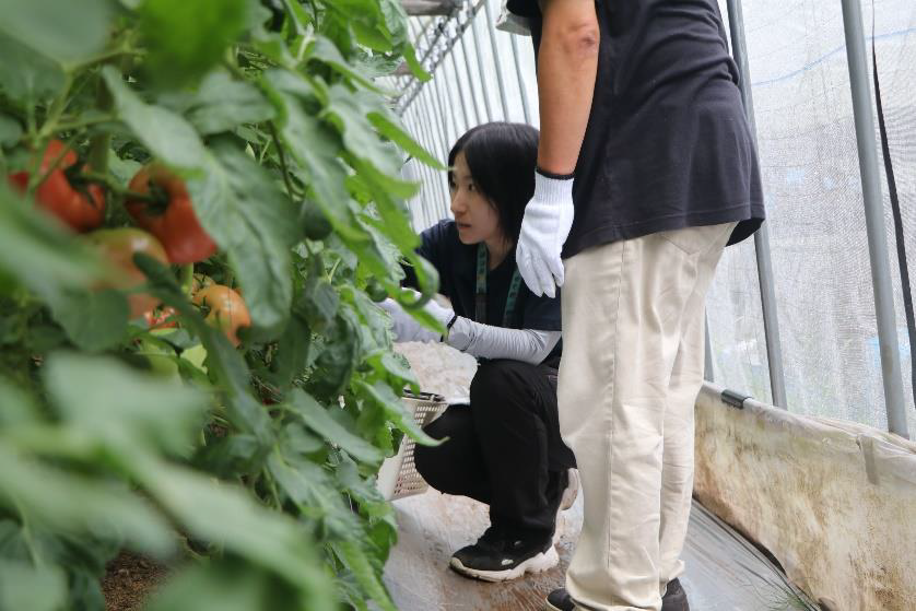 初めに農園から生育状況や収穫についての説明を受けた後、真っ赤に実ったトマトをカゴにいっぱい収穫しました。